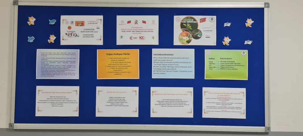 Okulumuzda Fizik Öğretmeni Ahmet ERASLAN ve Matematik Öğretmeni Fikret DURAN koordinesinde öğrencilerimiz tarafından Kodlama ve dijital okuryazarlığı herkes için eğlenceli ve ilgi çekici bir şekilde uygulanabilir hâle getirmek amacıyla 11 - 26 Ekim 2025 tarihleri arasında Kod Haftası (Code Week) etkinlikleri düzenlendi. Kod Haftası 2025 yılı teması "Yeşil Vatan" olarak belirlenmiştir. Kod Haftası kapsamında temel programlama, robotik teknolojileri, web tasarımı, mobil uygulama geliştirme, görsel/blok programlama, bilgisayarsız etkinlikler, artırılmış gerçeklik, giyilebilir teknolojiler,3B tasarım, yapay zekâ gibi konularda etkinlikler öğrencilerimiz tarafından incelenmiş ve 3 etkinlik uygulamaya geçirilmiştir. Etkinlikte yer alan öğrencilerimizi tebrik ediyoruz.